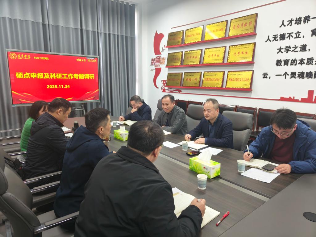 为明晰方向为学校下一阶段高质量发展凝聚共识,近日,校党委常委、副校长闫长春带领科技处、研究生处(学科建设办公室)等相关职能部门负责人,集中对全校11个二级学院开展了为期一周的深度调研。此次调研旨在全面掌握各学院核心工作推进情况,重点围绕“2025年横向经费目标完成路径”“2026年度国家自然科学基金项目申报”“硕士学位授予单位建设”及“学科点布局与建设”等关键议题把脉问诊、精准指导,此次系列调研覆盖全面、内容聚焦、指导性强,有效传导了压力、激发了动力。